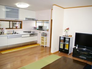 | キッチンと居間の間仕切壁を取り除き一体にする事で広さを演出し、キッチンの向きを変えることによって使いやすさを追求しました。 | 元々、和室だった部屋をリビングに改装しました。畳の部屋がなくなってしまうので、おしゃれな琉球畳を提案しました。フローリングとの相性も良く、段差がないのでつまづく心配もありません。 |
