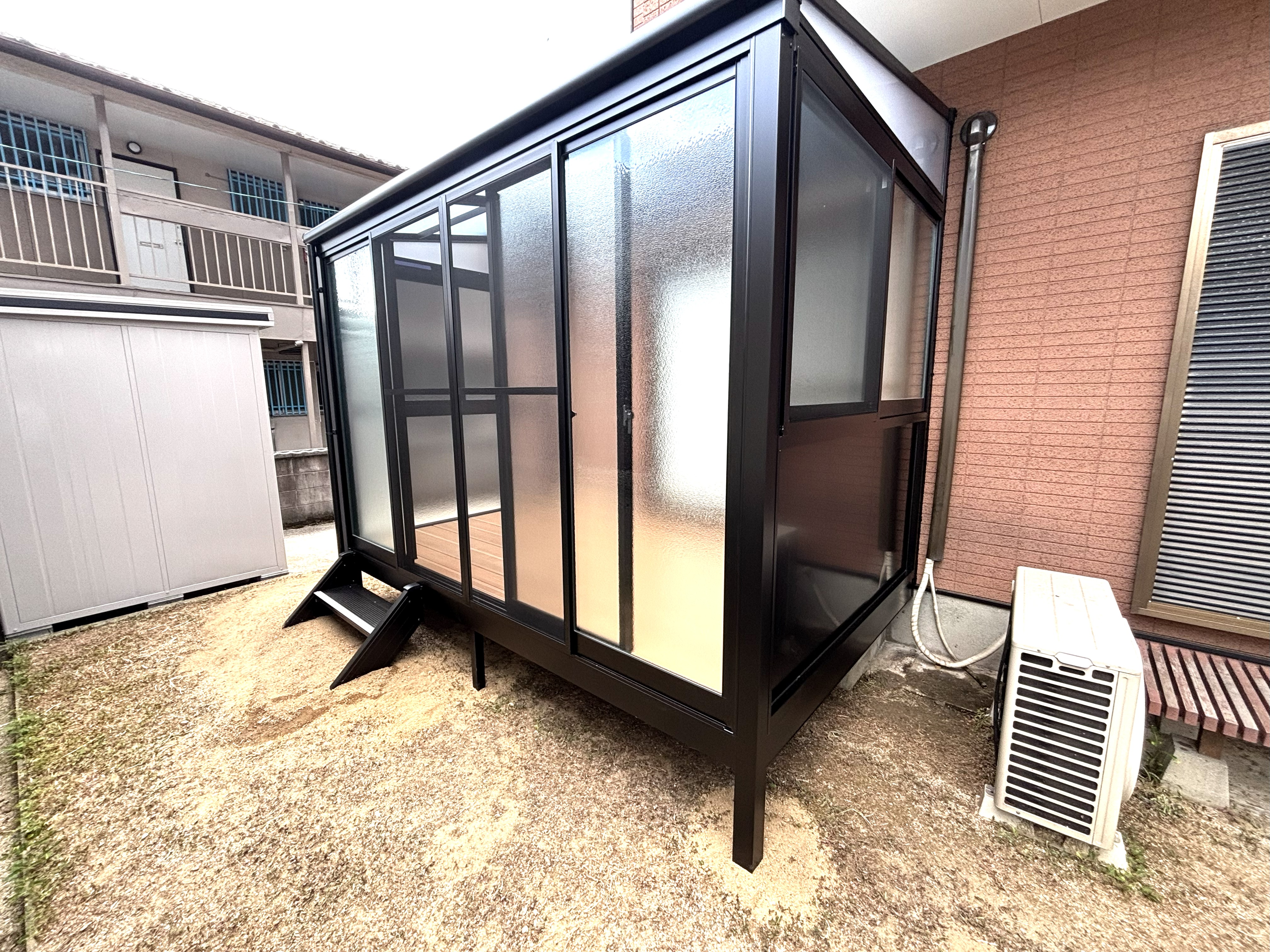 様々な用途で利用できるサンルームを設置しました。雨の日も安心です。十分な広さがあり、床は温かみのあるウッド調です。シンプルで機能的なサンルームが出来ました。 |