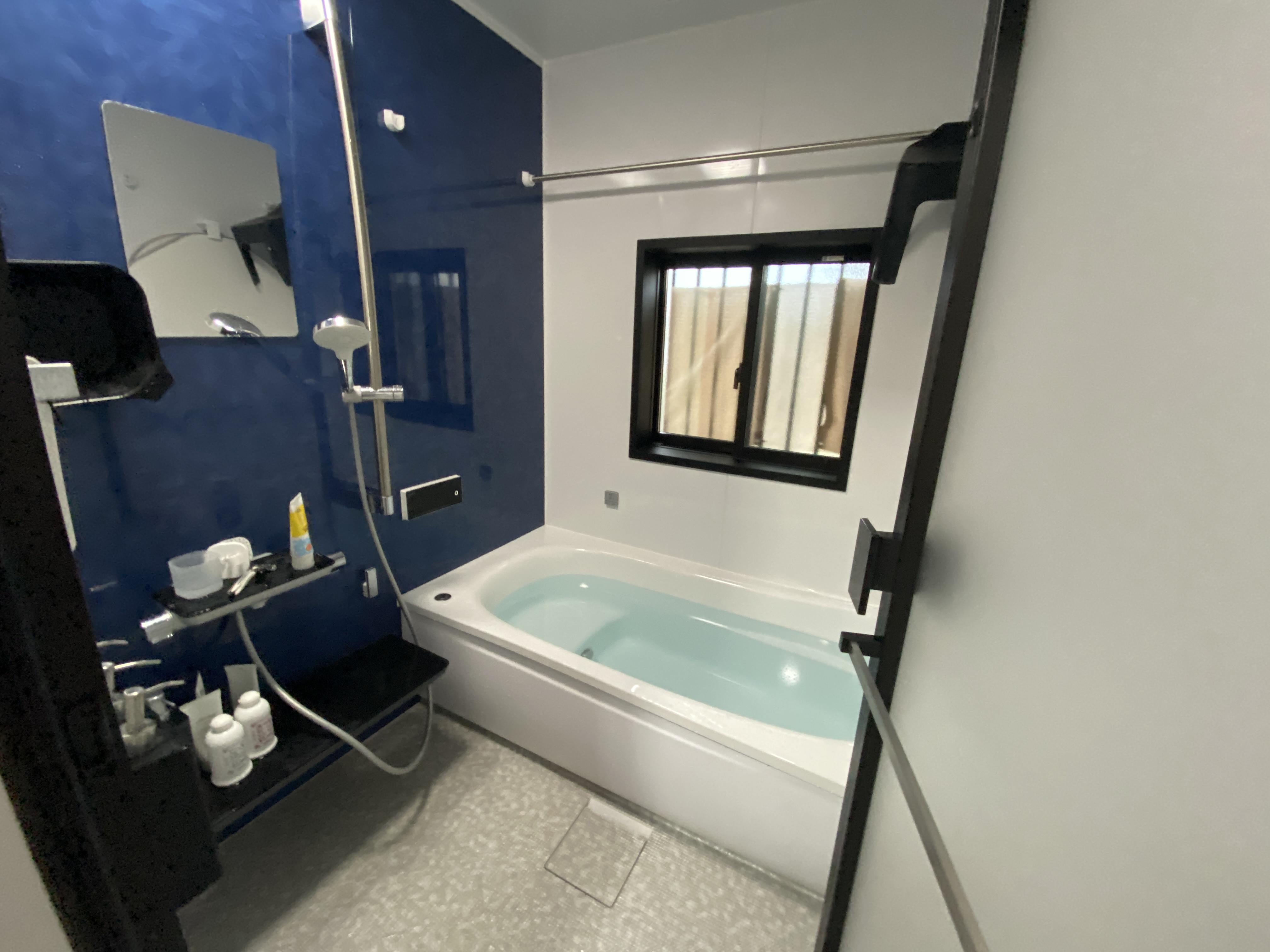 | 20年以上前のシステムバスでした。 | 最新のシステムバスになり、断熱性と清掃性がグンと上がりました。青色のアクセントパネルも素敵です。 |