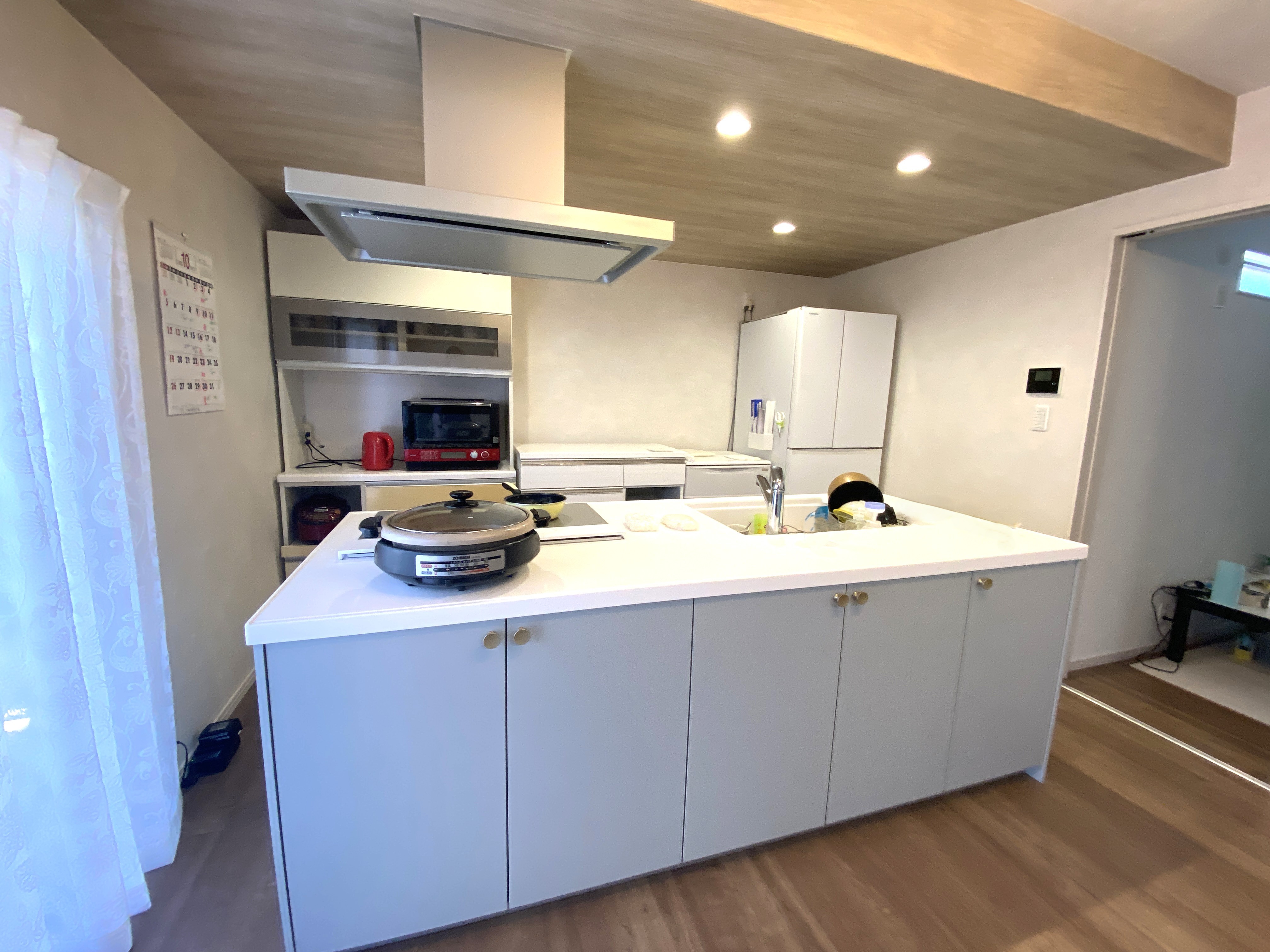 Panasonic ラクシーナ 白基調の人造大理石カウンターで華やかなアイランドキッチンになりました。作業動線も考えられており、広々としているのでお子様とも料理を楽しむことが出来ます。収納付きなので、ダイニング側からお菓子や保存食なども取り出せ、収納力抜群です。 |