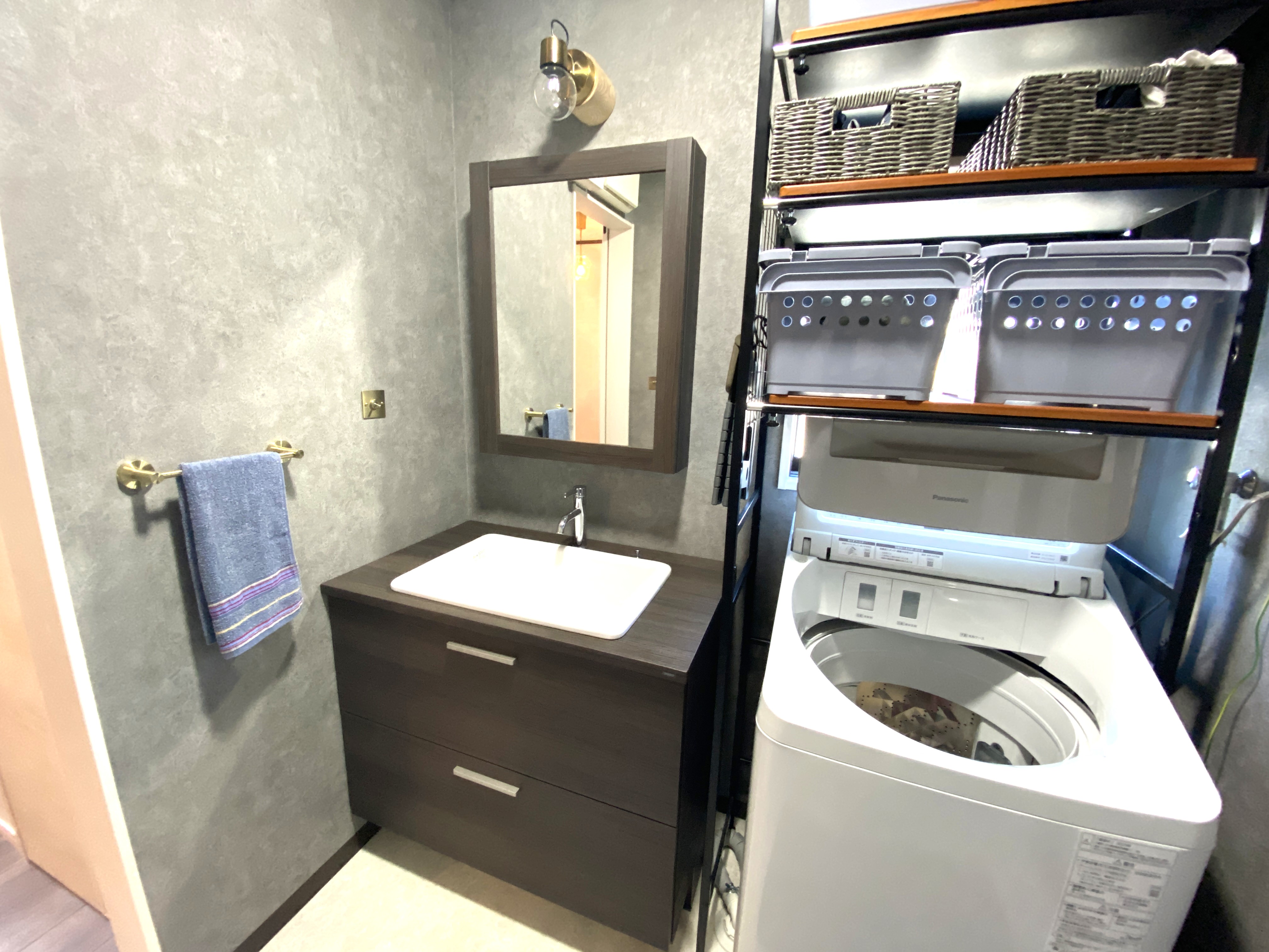 お客様がご準備されたスイッチや照明器具ととてもマッチしていて、とてもオシャレな洗面化粧台です。色も落ち着きがありシックで使いやすくお掃除もしやすいです。 |