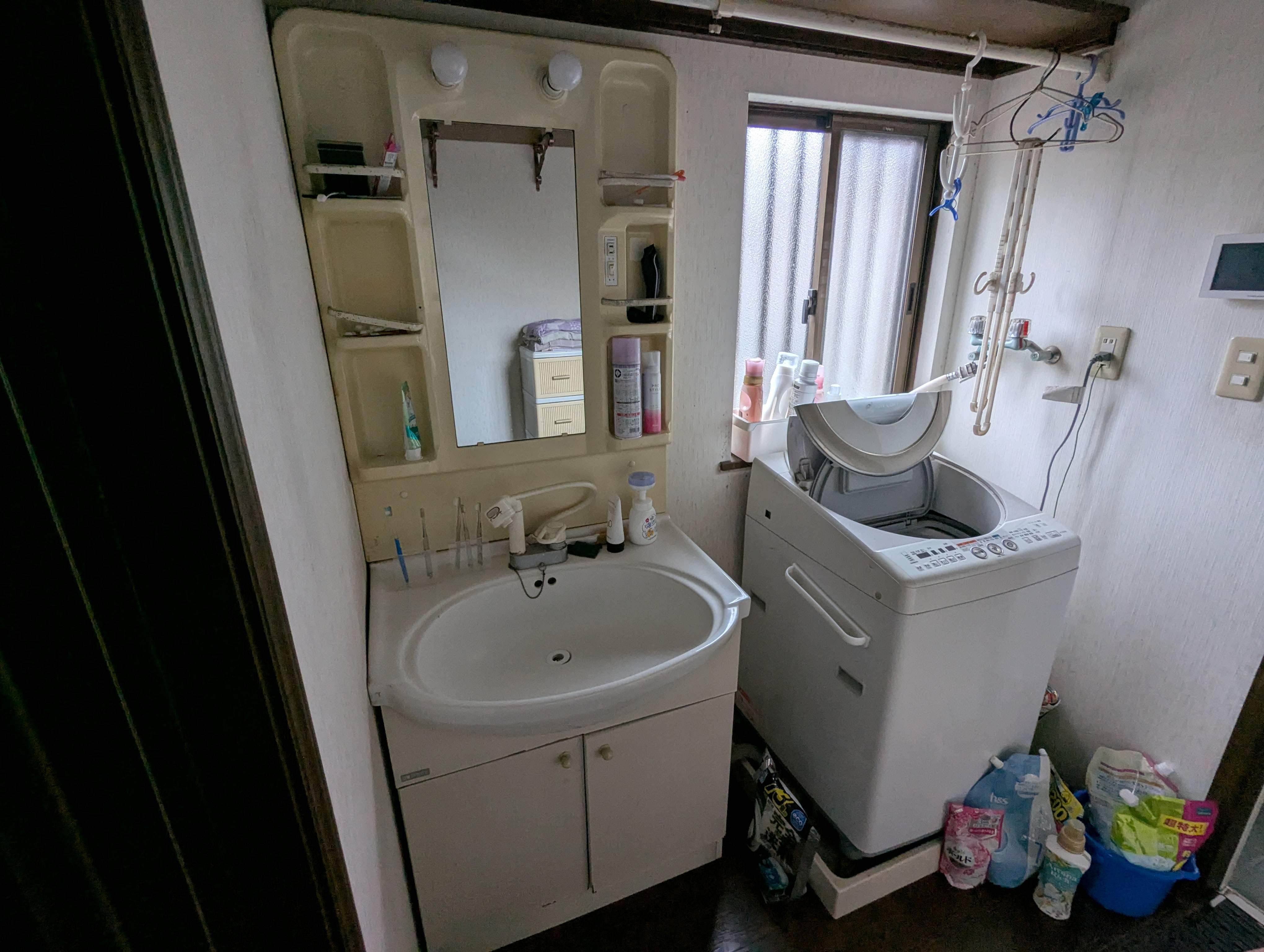 | 洗面化粧台の扉は観音開きの為、出し入れも少し大変でした。 | スッキリとした洗面化粧台になり、引き出し収納になった為出し入れがラクになりました。内装も一新し、一気にオシャレな空間に生まれ変わりました。 |